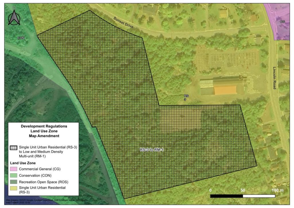 The Town of Grand Falls-Windsor wishes to amend the Land Use Zoning map of the Development Regulations to enable a wider range of housing options on lands already designated for residential use in the Municipal Plan. Council wishes to be proactive in allowing for higher density uses in response to the increased interest by the community. The Town wishes to address the high cost of housing and housing affordability challenges of the residents of Grand Falls-Windsor. The purpose of this is to re-zone land on Lincoln Road from Single Unit Urban Residential (RS-3) to Residential RM-1 Low and Medium Density Multi-Unit Residential.