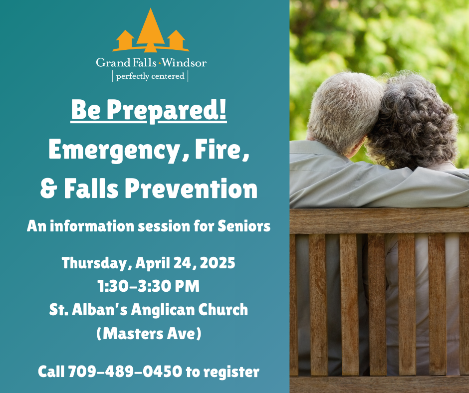 We are happy to be hosting a free Emergency, Fire, and Falls Prevention information session for Seniors on Thursday, April 24th, 2025, from 1:30-3:30 PM at St. Alban’s Anglican Church. Join us for an in-depth presentation with tips and checklists on how to stay safe. Our guest speaker will be Firefighter Ryan Stacey of the Grand Falls-Windsor Fire Department.
