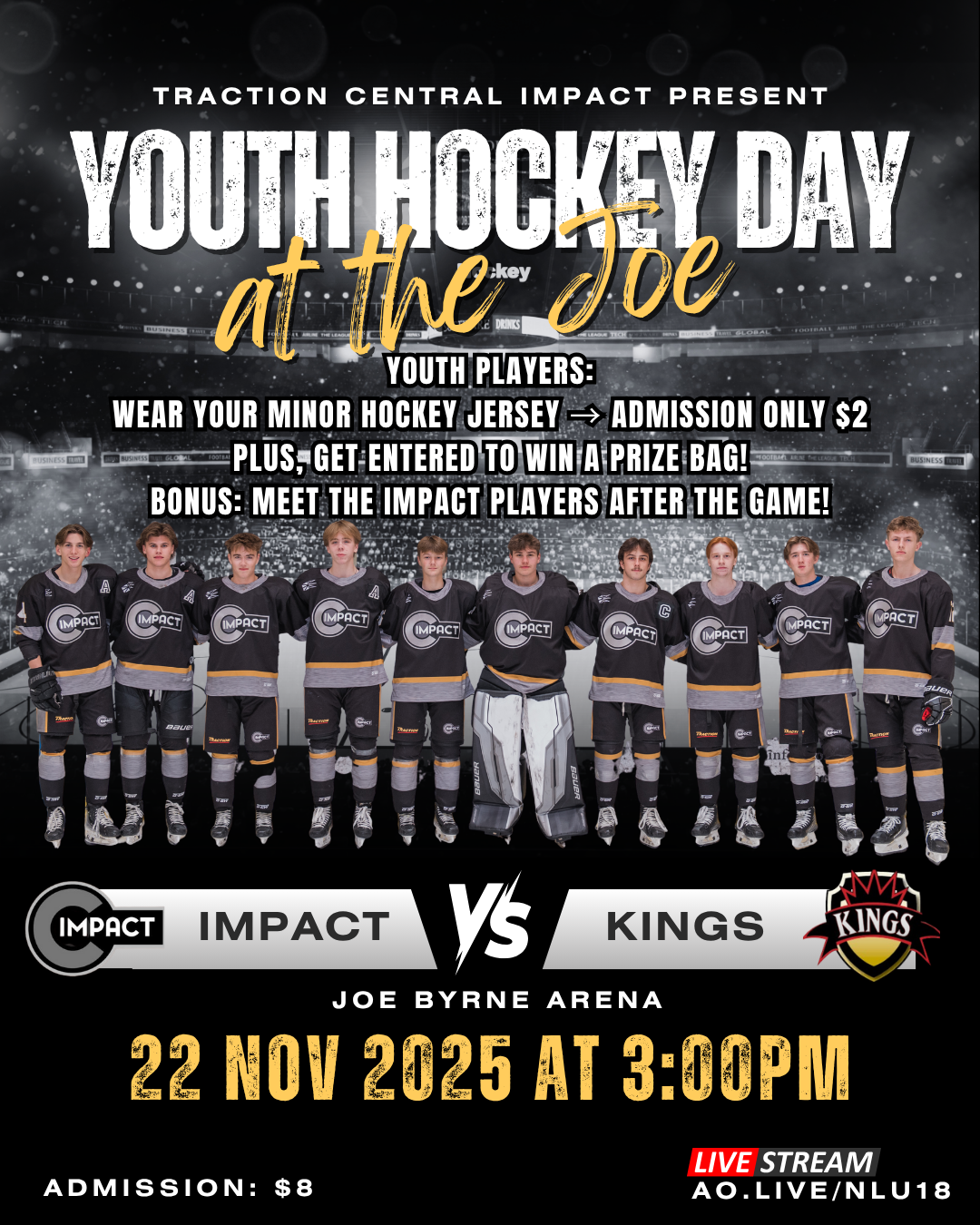Join us this Saturday, November 22nd at 3:00pm at the Joe Byrne Arena as your Traction Central Impact take on the Western Kings! Youth Players: Wear your minor hockey jersey and get in for only $2 – plus you'll be entered to win a prize bag! Bonus: Meet the Impact players after the game Bring your teammates, bring the energy, and pack the Joe! Admission for adults: $8
